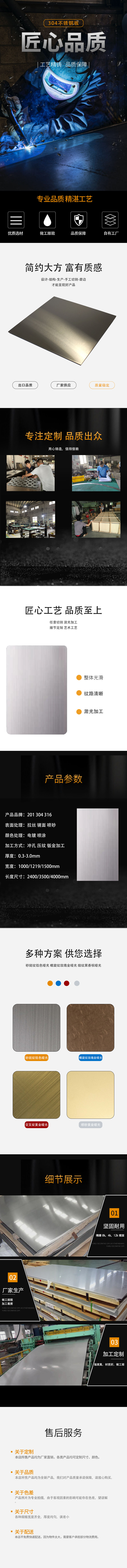 | 产品名称 | 不锈钢装饰板 | 可选材质 | 根据成分的不同,主流的装饰不锈钢有三种型号。 ● SS201 ● SS304 ● SS316 |